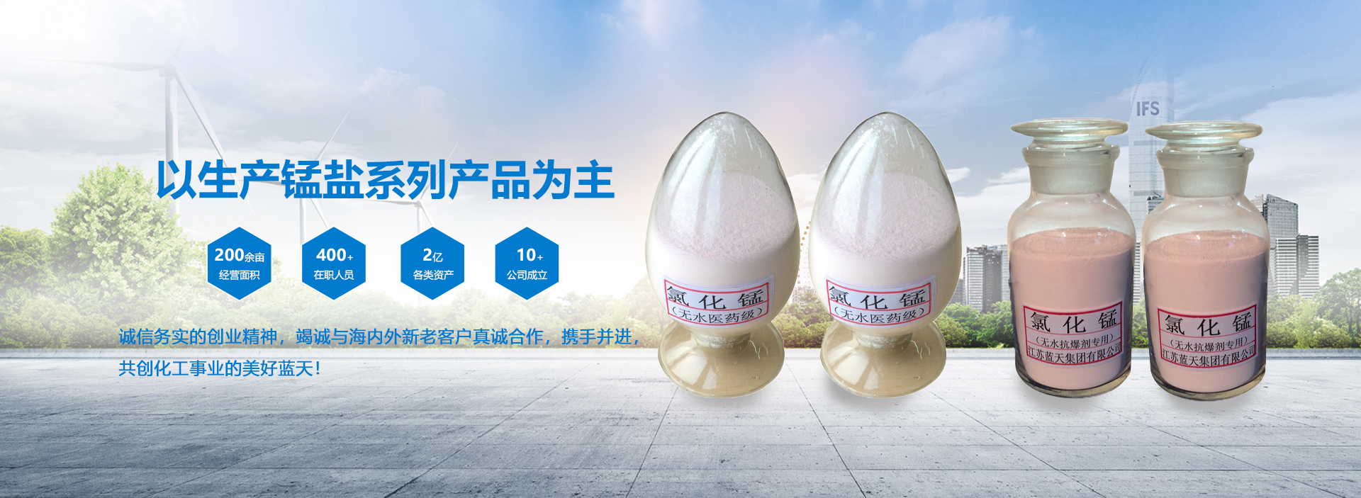淮安市蓝天化工无限公司,因此出产锰盐等无机盐系列产物为主。农药中间体、医药中间体加工、新产物研发为一体的大型综合性民营企业。公司营业遍布国表里数十个都会与地域,现具备各种资产2亿多元,出产运营面积200余亩,员工400多人。此中各种专业手艺职员占1/3以上。并具备较强的手艺研发和出产才能。现已开端构成一支高本质、敬业爱岗、清廉高效的作战团队。